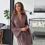 Robe and pajama set in milk chocolate viscose — femininity meets comfort.